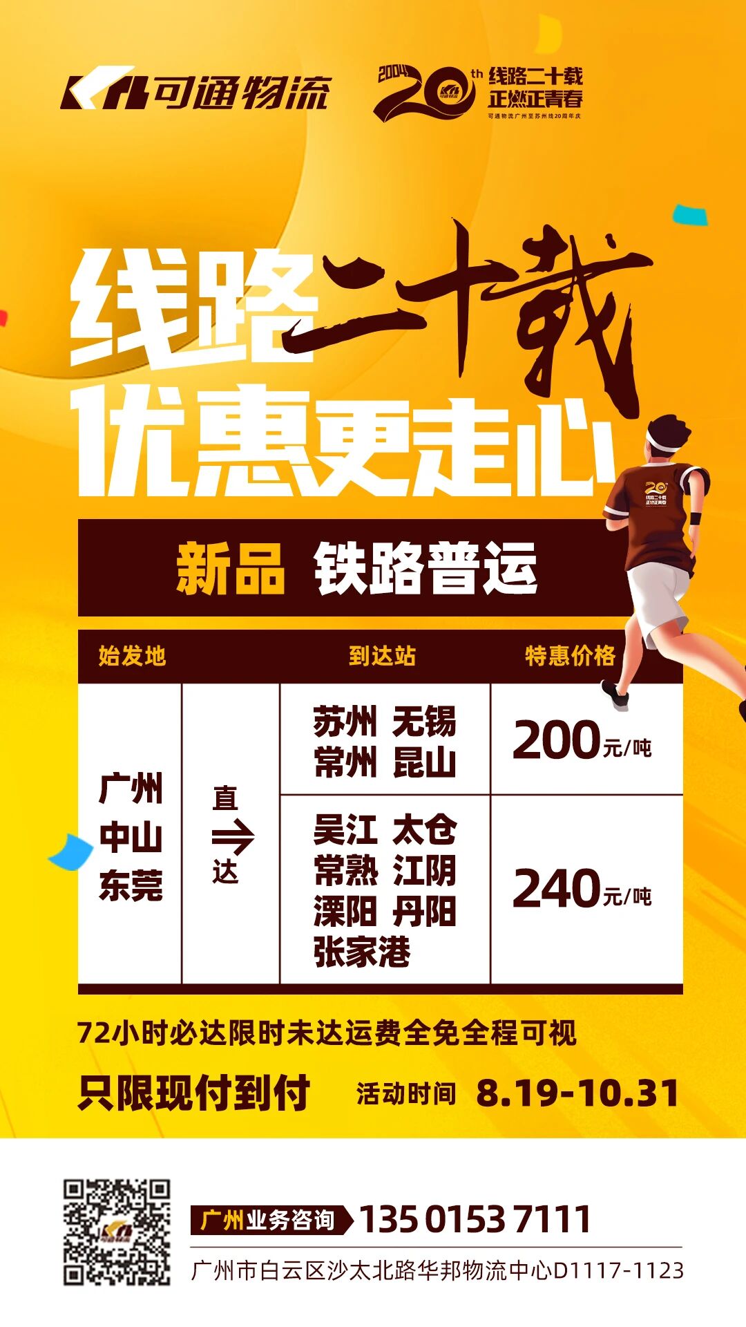 线路二十载,优惠更走心。为回馈广大客户长期以来的支持与厚爱,值此二十周年庆典之际,可通物流特别为新品“铁路普运”定制优惠方案,新产品只限现付到付,72小时必达,限时未达运费全免。活动期间,凡选择《铁路普运》产品的客户,均可享受此优惠政策。让我们共庆二十周年,共享优惠新品。